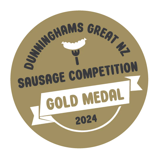 Gold medal badge for the 2024 Dunkingham's Great NZ Sausage Competition with a sausage illustration at the top.